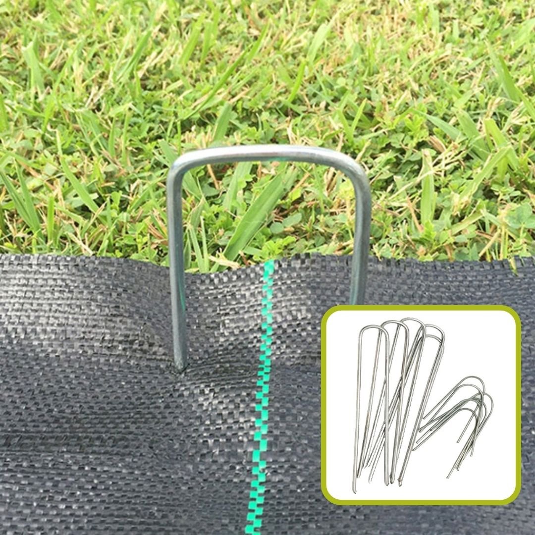 The staples are U-shaped and 3 mm thick. They are made from either galvanized or stainless steel. Depending on the soil density, they can be installed with a soft hammer or